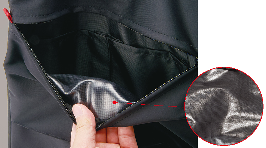 | 起毛素材でやさしく保護 | 水滴から収納物を守る防水コート |