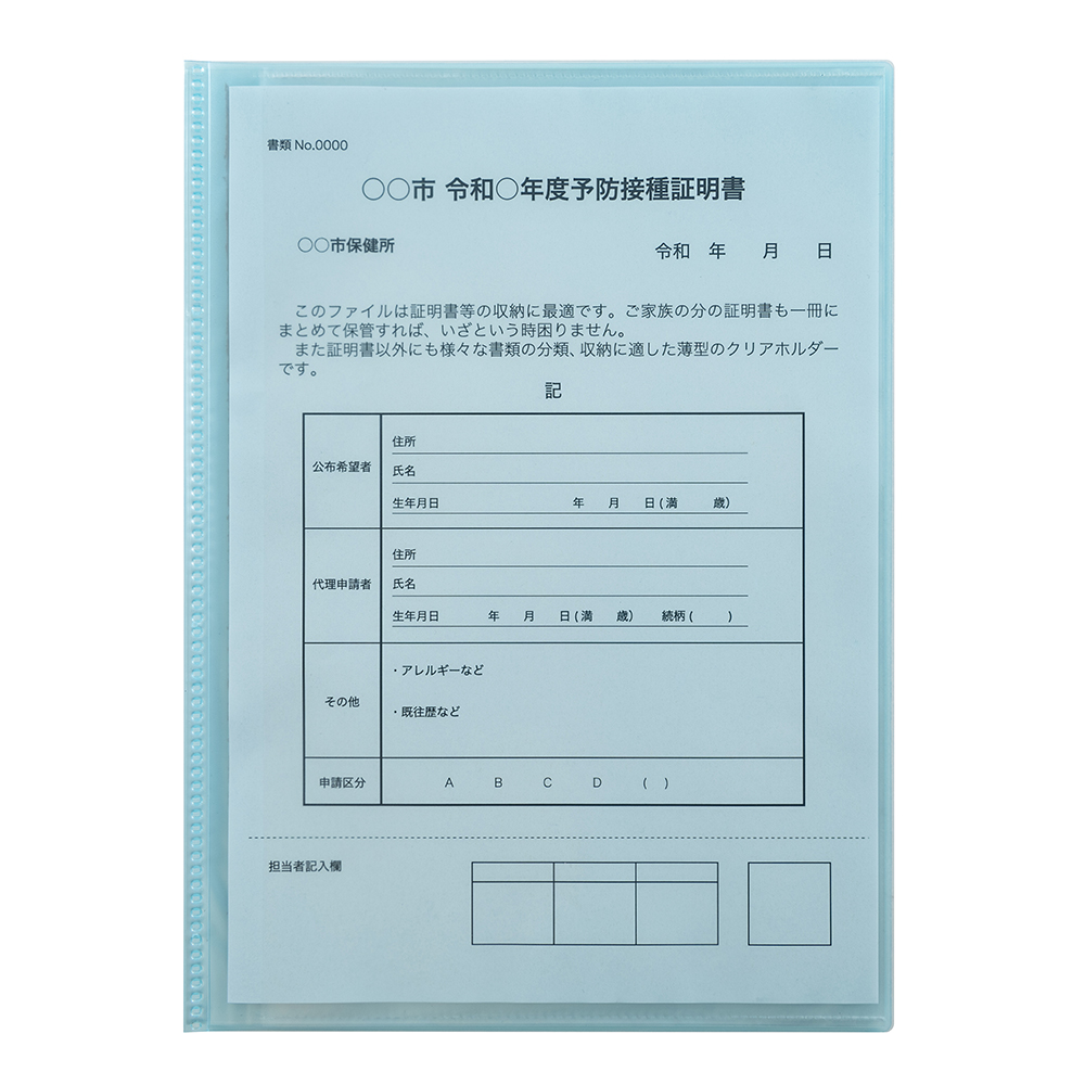 厚みをとらず、かさばらない「超薄型」予防接種・ワクチン接種証明書。各種書類をサッとひとまとめ。