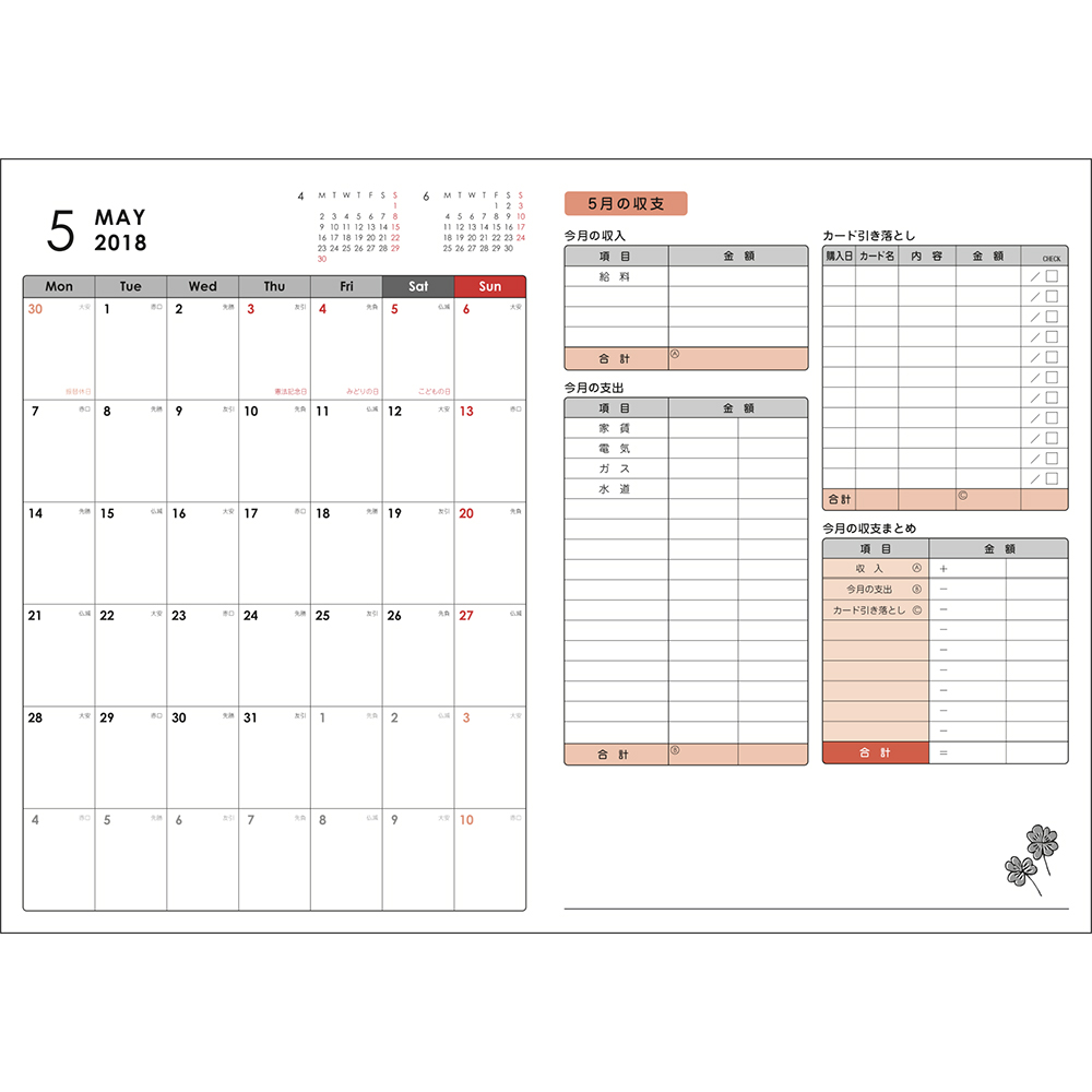 シンプルな構成で見やすく使いやすい家計簿ダイアリー。別冊のフリーポケット付きです。