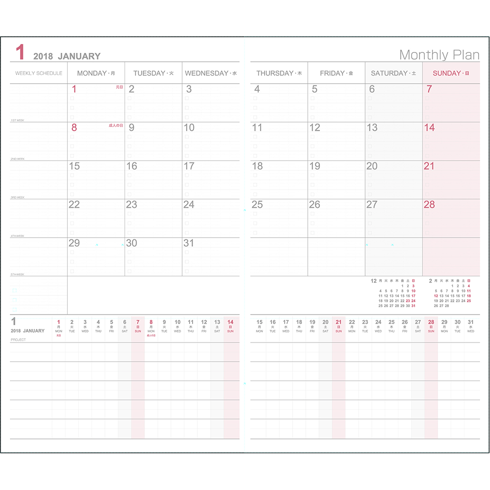 シンプルなデザインのペンホルダー付き透明塩ビのカバー表紙です。汚れや折れが気になりません。スマートに携帯できるB5スリムサイズです。持ち運びは、手に収まりやすく、開けば一度に見渡せて無駄なく書き込みができます。見開き1ページで、月間ブロックとガントチャートの両方を見ることができるレイアウトです。一ヶ月の予定を見ながらプロジェクトの進行管理ができます。