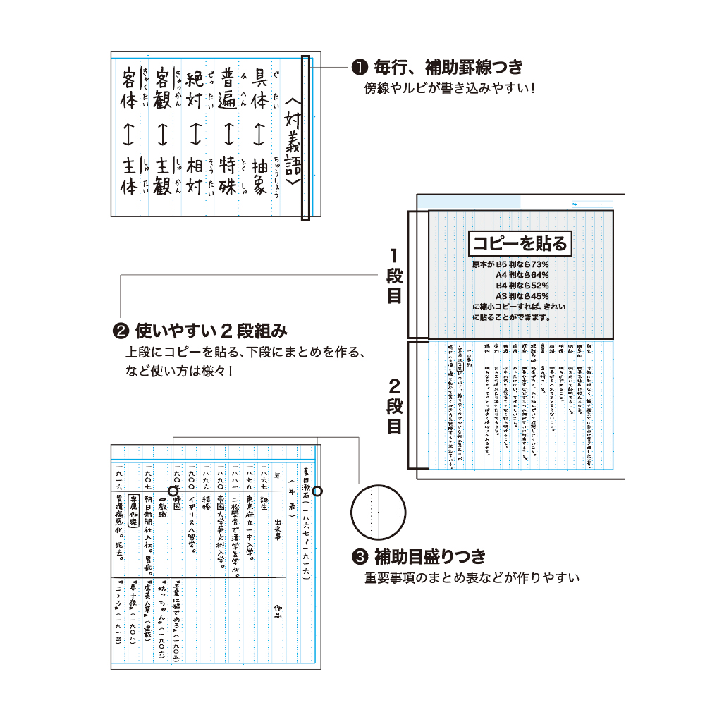 上段に資料を貼る、下段にまとめ内容を書き込む等の様々な使い方が可能補助目盛
