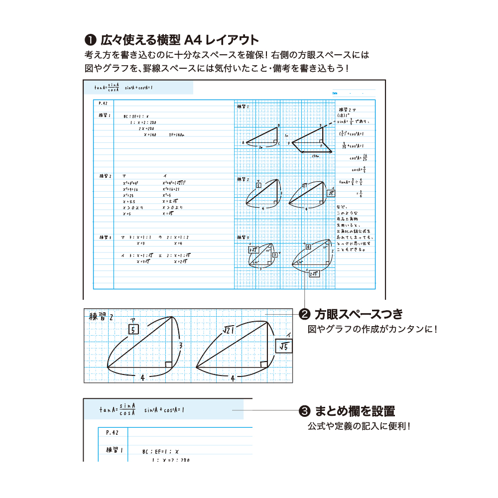 数式や図・グラフなどを広々と記入できる方眼スペース