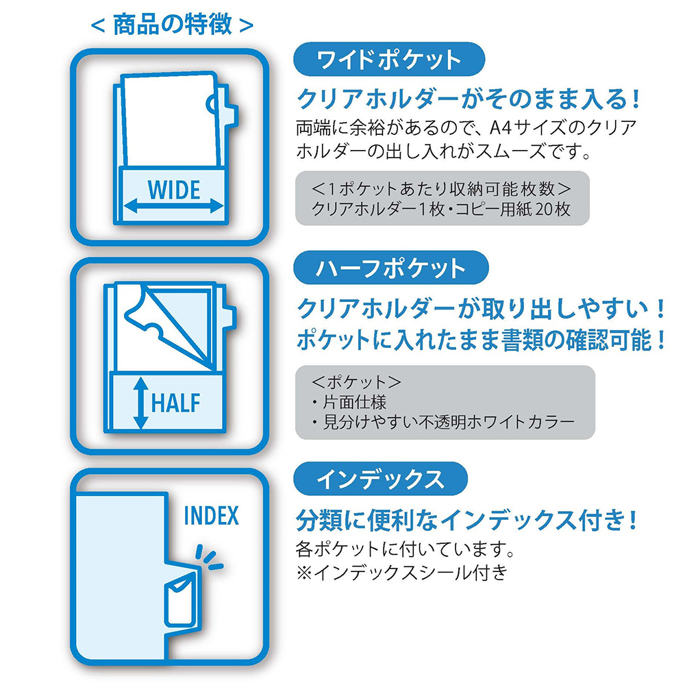 ハーフ&ワイドポケットで、クリアホルダーの出し入れがしやすく、ポケットに入れたまま書類の確認も可能です。