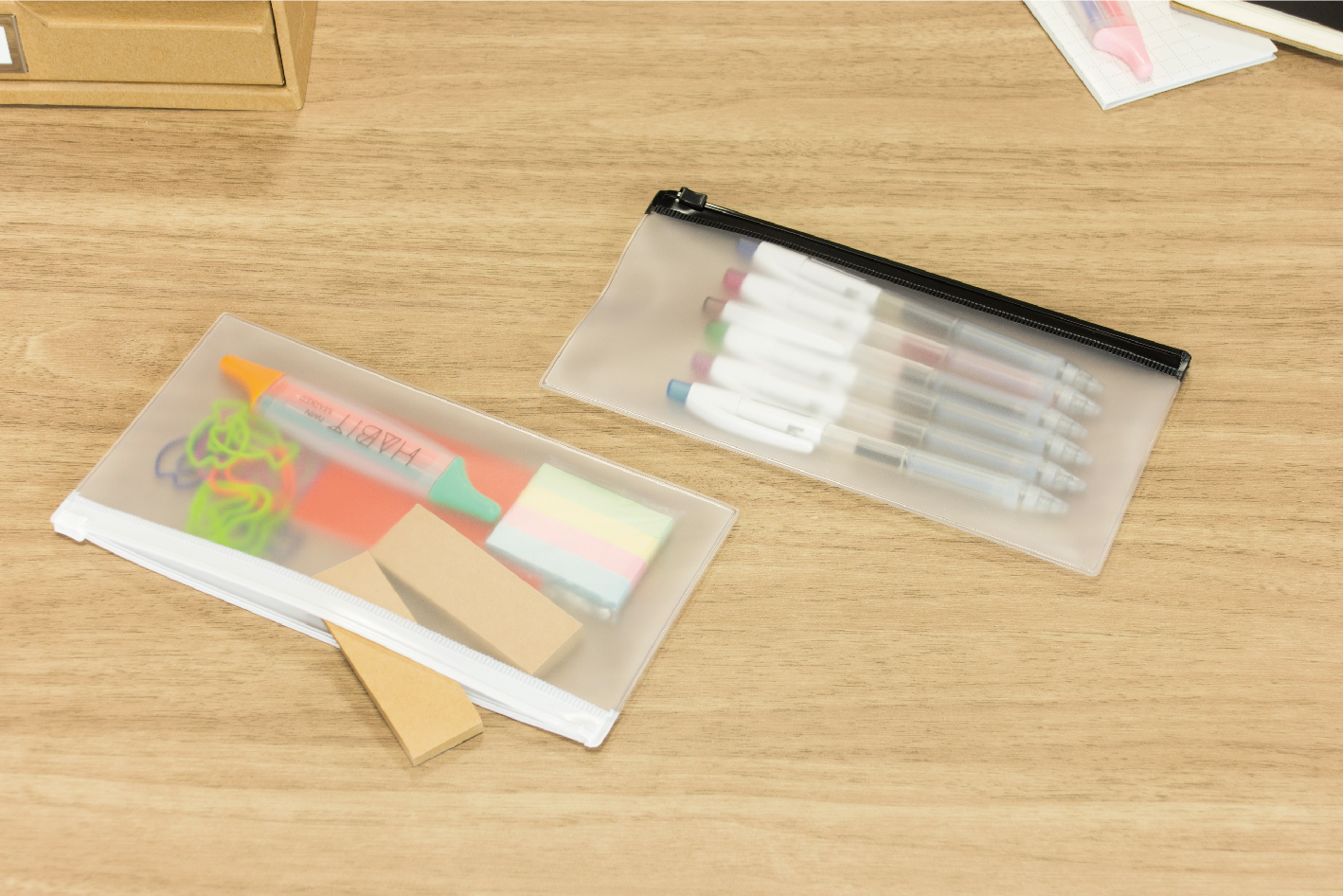 「抗菌PVC製ペンケース」はスリムなマチなし形状のため、持ち運びの際にかさばりません。ペンケースだけでなく、付箋などの文具・小物、マスクなどの衛生用品の携帯にも最適です。