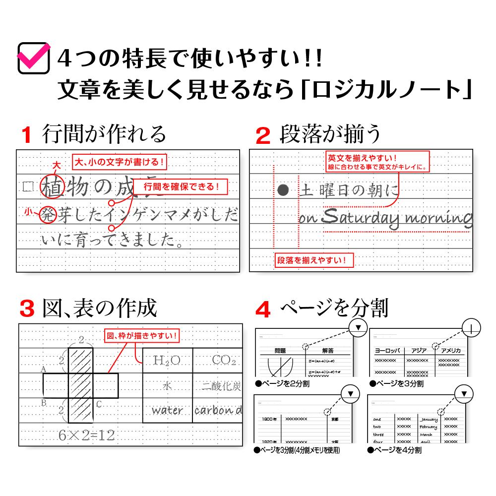 本文罫は、ノートのまとめやすさにこだわり分割メモリを入れるなど工夫を凝らした「ロジカル罫」を採用していますページ上下の3分割、4分割メモリを使用して、単語帳やリスト作成など様々な用途に活用できます