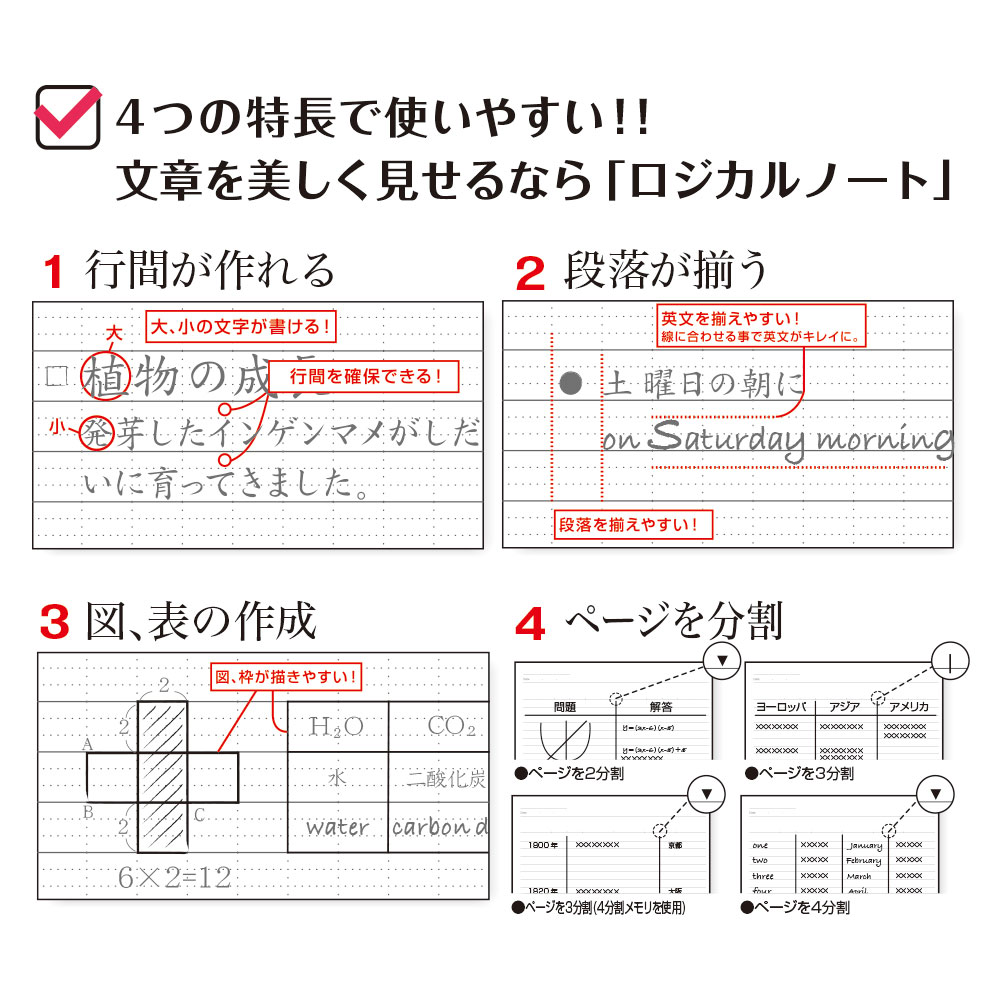 本文罫は、ノートのまとめやすさにこだわり分割メモリを入れるなど工夫を凝らした「ロジカル罫」を採用していますページ上下の3分割、4分割メモリを使用して、単語帳やリスト作成など様々な用途に活用できます。