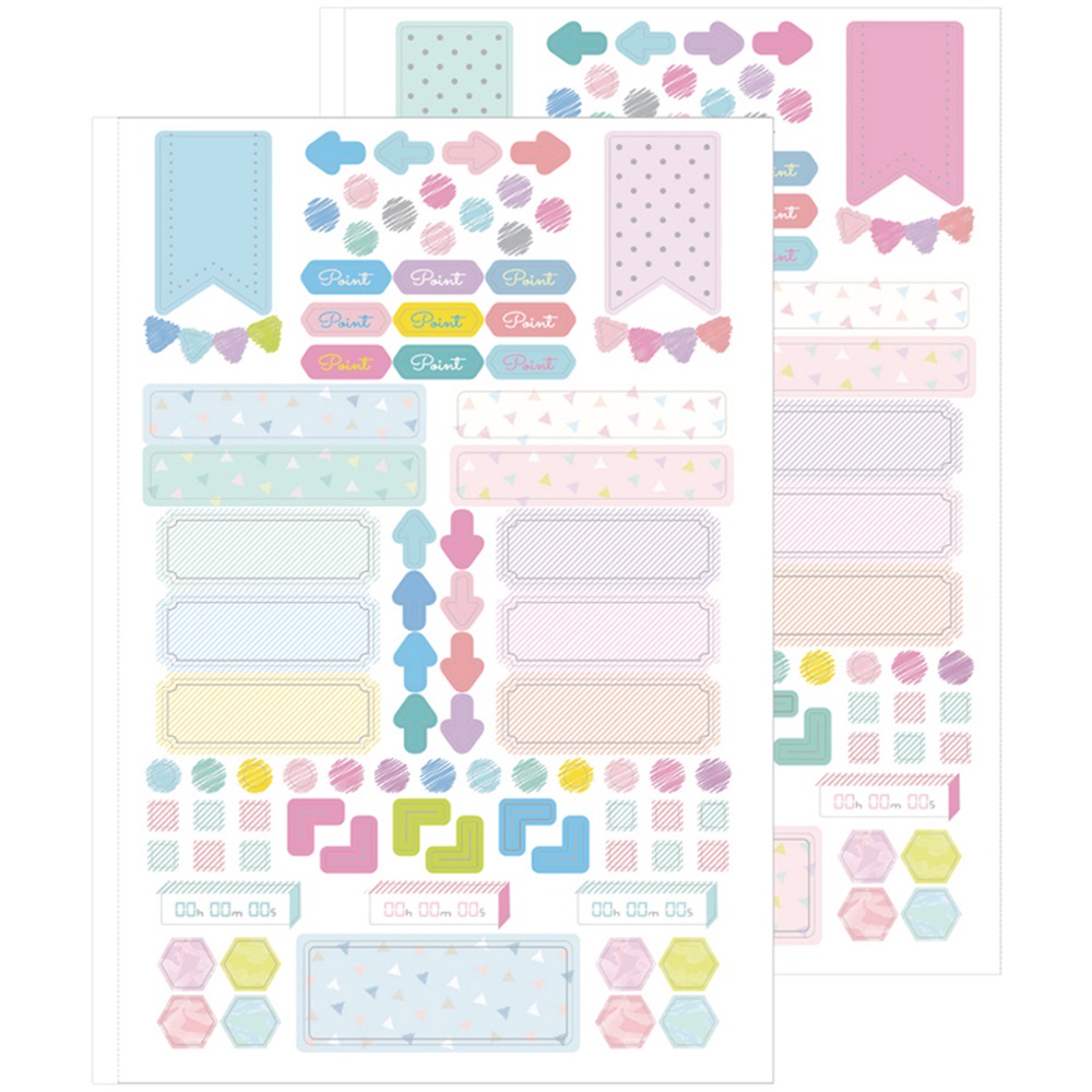 勉強内容や日々の記録を、SNSなどに投稿するニーズに合わせ、デコレーションシールを2ページ分付属しています(ノートから切り取れるミシン目入り)。まとめノートづくりや、表紙のデコレーション、科目内容の記入などにお使いいただけます。