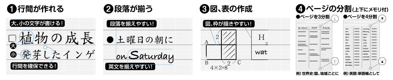 - 白いガイドラインのため記入内容を閲覧・スキャニングする際も目立ちすぎず、一般的な横罫ノートとして使える