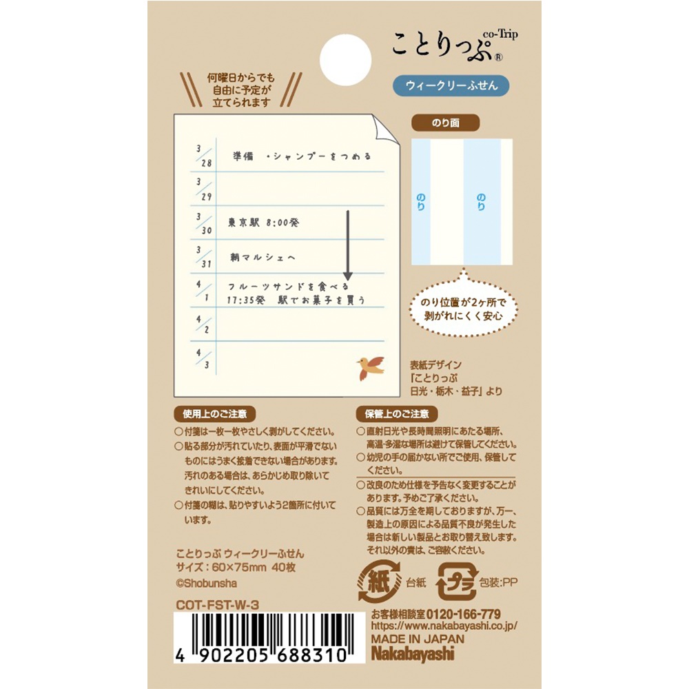 製品名/品番 ことりっぷ 付箋 ウィークリー / COT-FST-W 価格 400円+税 ラインアップ 1、2、3