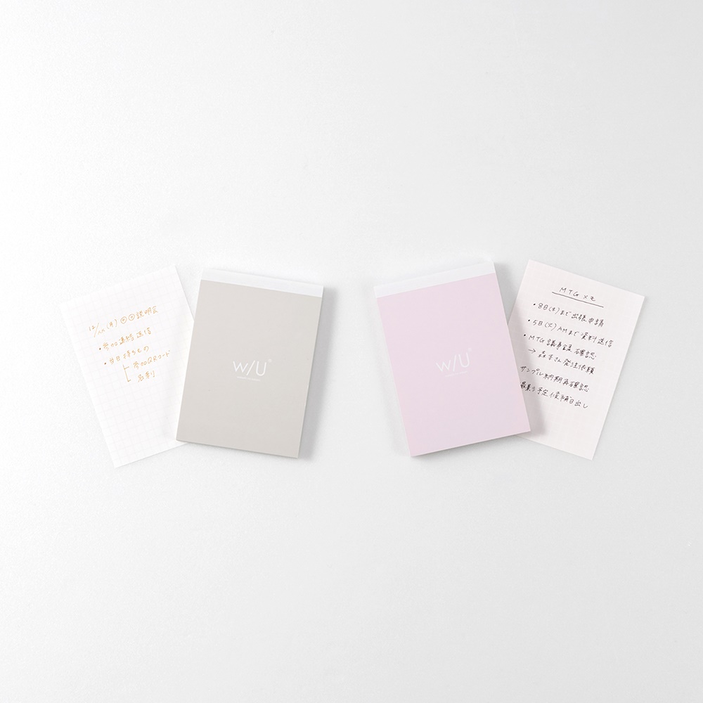 製品名/品番 w/U A7ブロックメモ / WU-A702 メーカー希望小売価格 270円(税込297円) ラインアップ シルキーグレー(GY)、シェルピンク(P)、パウダーブルー(B)、ピスタチオグリーン(G)、スモーキーブラック(D) 本体寸法/重量 ヨコ74×タテ105×厚み10.5mm / 約63g 材質 表紙:コートボール紙 / 本文:上質紙100枚