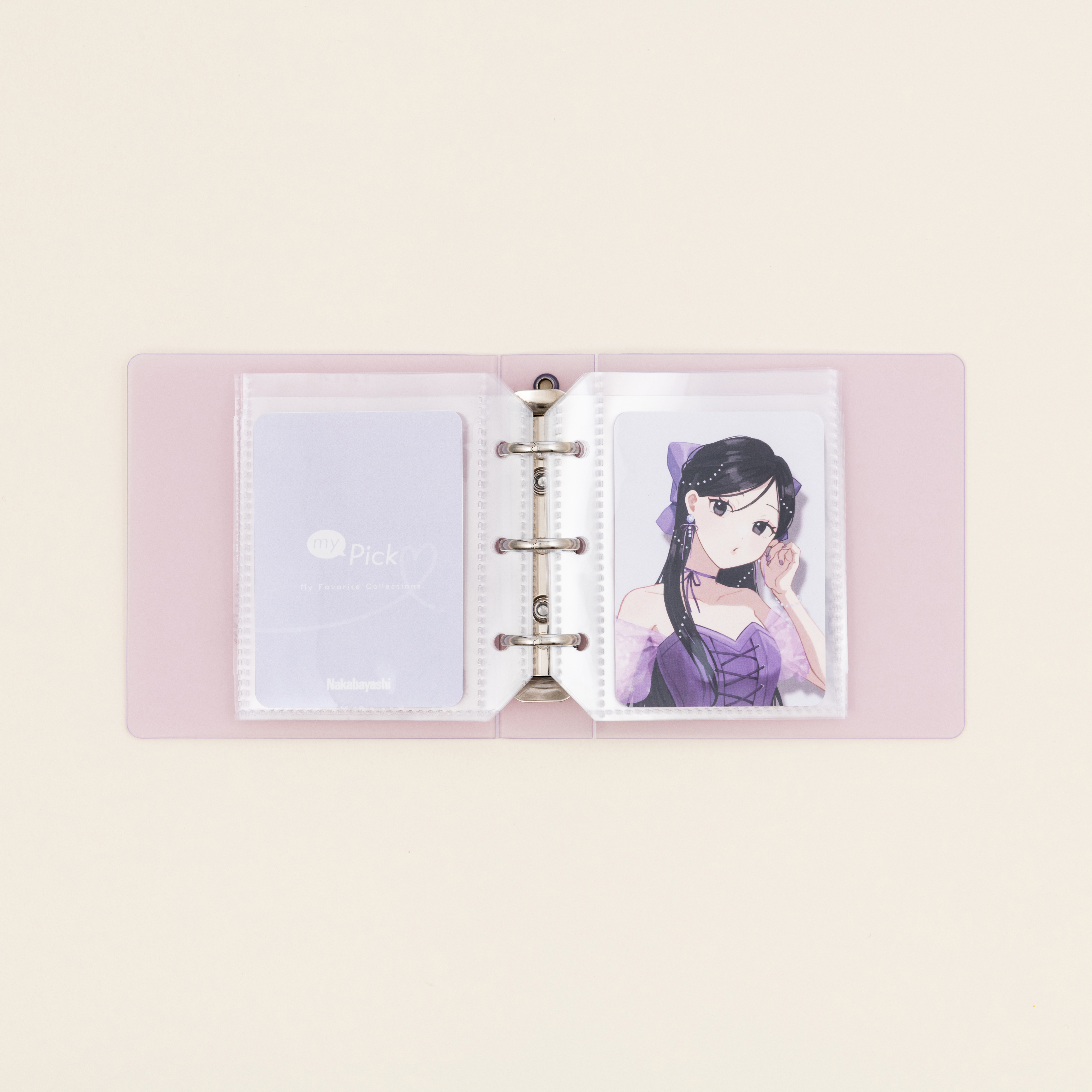 お気に入りの写真やブロマイドを持ち運ぶのに便利なポケットサイズのバインダーアルバムです。内容物が透けて自分好みにカスタマイズができるクリア表紙を採用しました。キーホルダーが付けられるストラップホール付き。