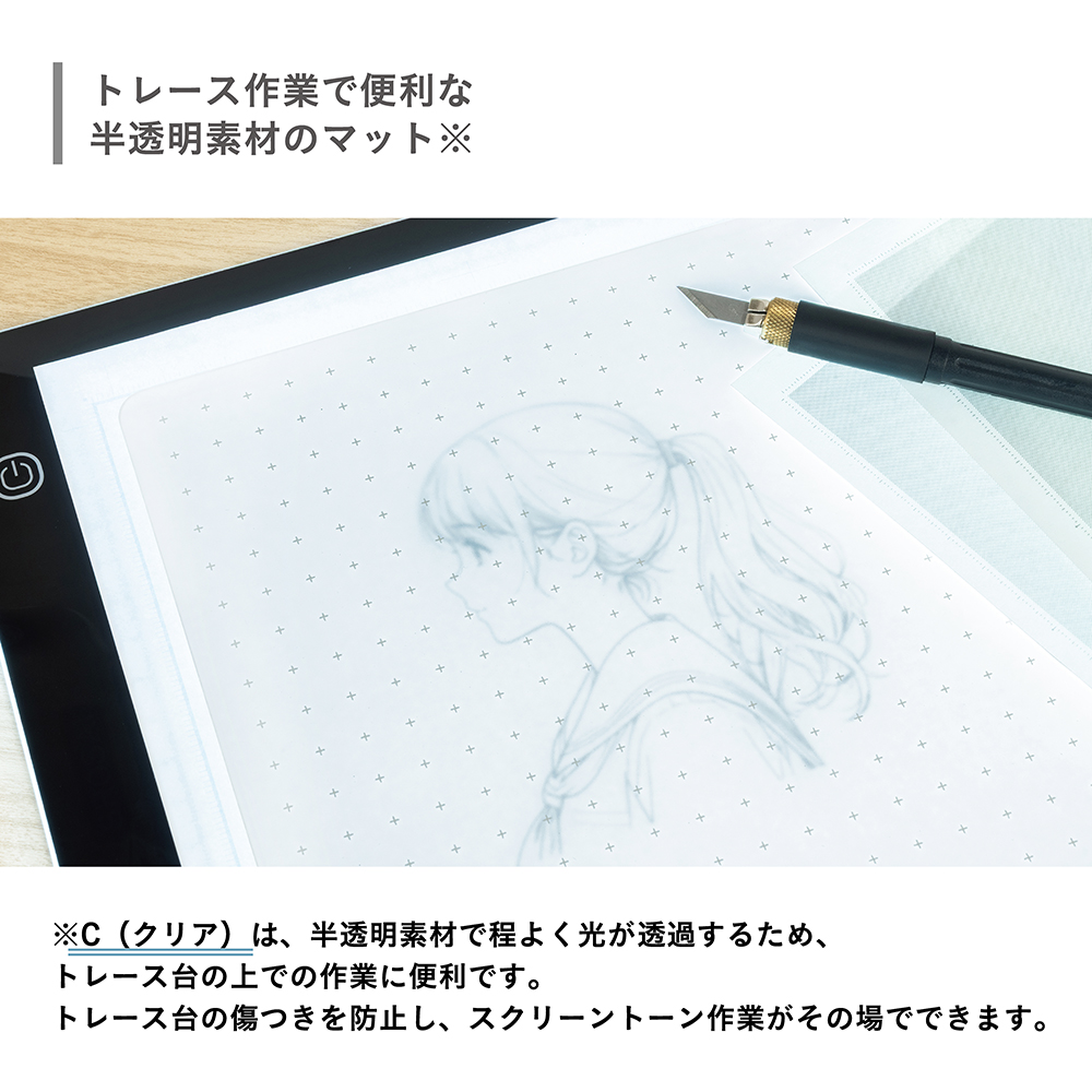 - C(クリア)は半透明素材で程よく光が透過するため、トレース台の上での作業に便利