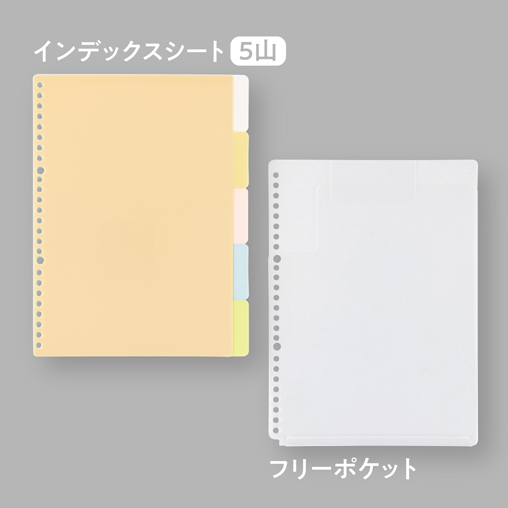 - 科目や項目などの分類に便利なインデックスシート5山+未使用のルーズリーフや資料などを収納できるフリーポケット1枚が付属