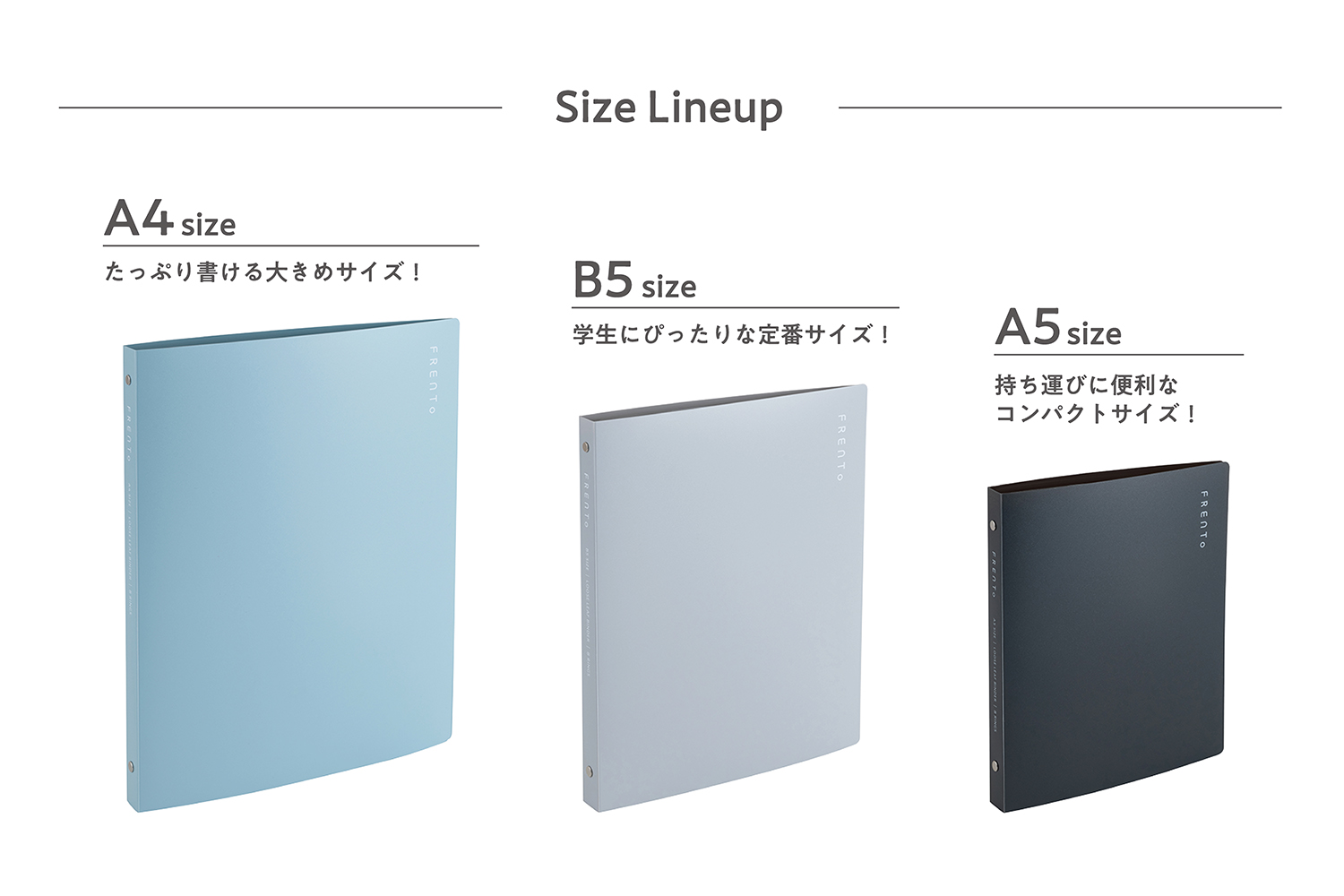 サイズはたっぷり書けるA4サイズ、学生の定番B5サイズ、持ち運びに便利なA5サイズの3サイズをラインアップ。カラーは学校だけでなくお仕事にも使いやすい落ち着いた4色を採用しました。フレントがあればルーズリーフを追加・差し替えができるバインダーノートの使い心地はそのまま、授業中やお仕事中に感じていた「リングへの煩わしさ」を解決できます。
