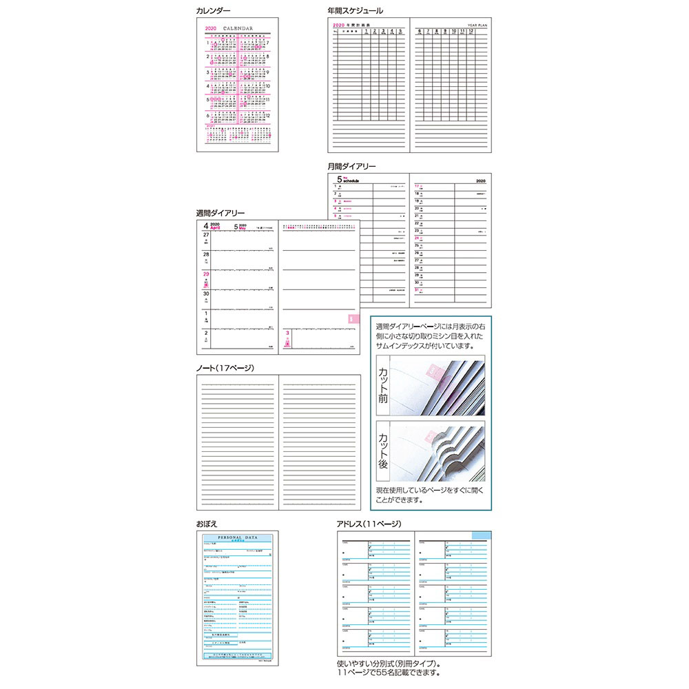 | 内容 | カレンダー、年間スケジュール、月間スケジュール(翌年4月まで)、週間スケジュール、ノート、別冊アドレス、おぼえ |
