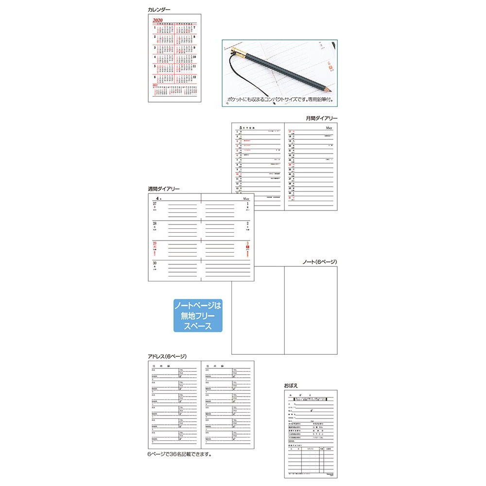 | 内容 | カレンダー、月間スケジュール(翌年4月まで)、週間スケジュール、ノート、アドレス、おぼえ、手帳用鉛筆付 |