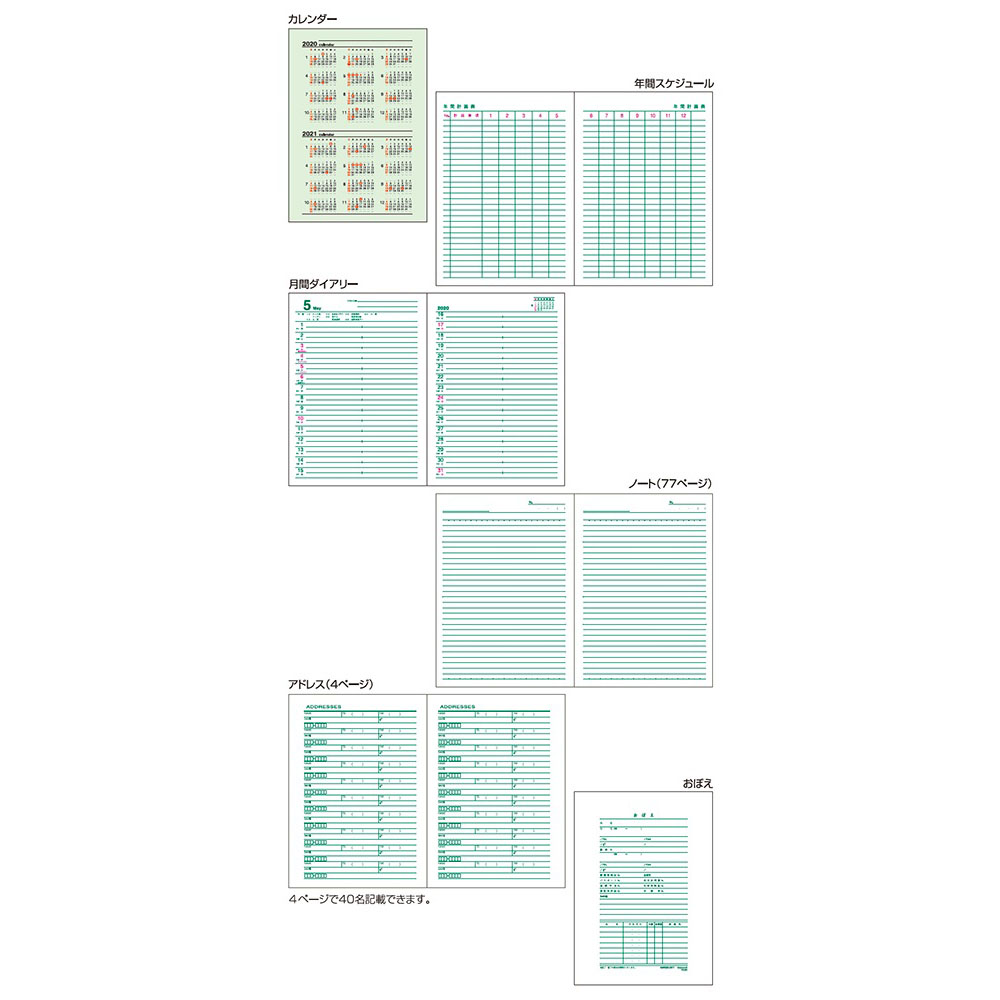 | 内容 | カレンダー、年間スケジュール、月間スケジュール(翌年4月まで)、ノート77頁、アドレス、おぼえ |