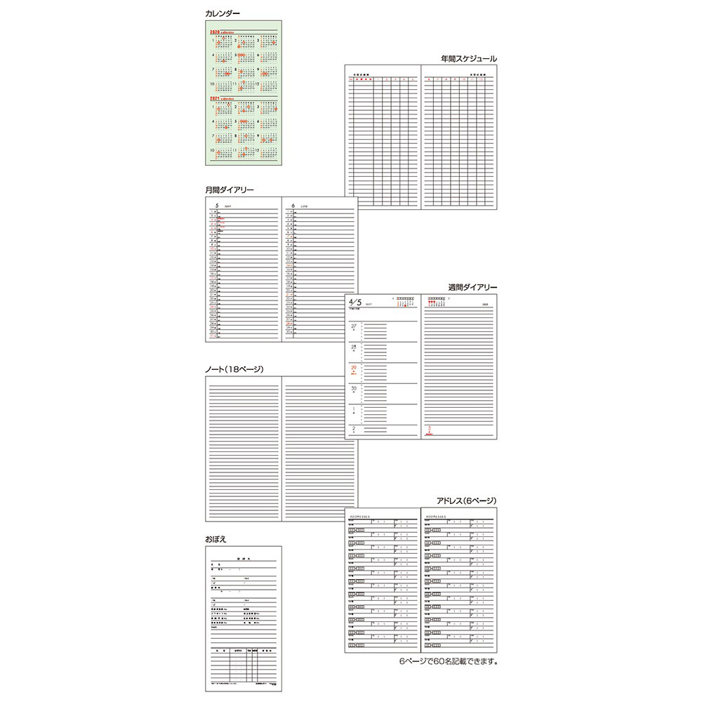 | 内容 | カレンダー、年間スケジュール、月間スケジュール(翌年4月まで)、週間スケジュール、ノート、アドレス、おぼえ |
