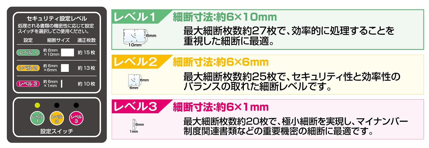 | 定格細断枚数(A4上質紙64g/m²) | <レベル1>約15/15枚(50/60Hz) <レベル2>約13/13枚(50/60Hz) <レベル3>約10/10枚(50/60Hz) |