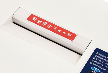 細断中、紙の付着などにより、投入口のセンサーが一定時間細断物を検知し続けた場合に自動停止します。 - 安全停止スイッチ