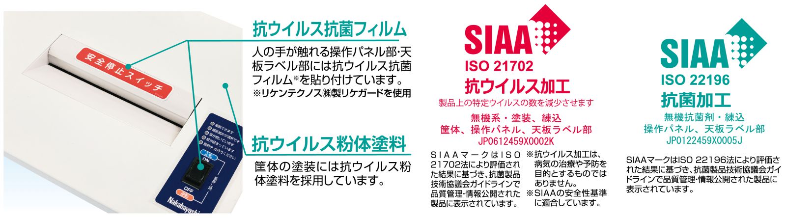 シュレッダ筐体の塗装には抗ウイルス粉体塗装を採用。また人の手が触れる操作パネル部や天板ラベル部には抗ウイルス抗菌フィルムを貼り付けており、製品を清潔に保つことができます。