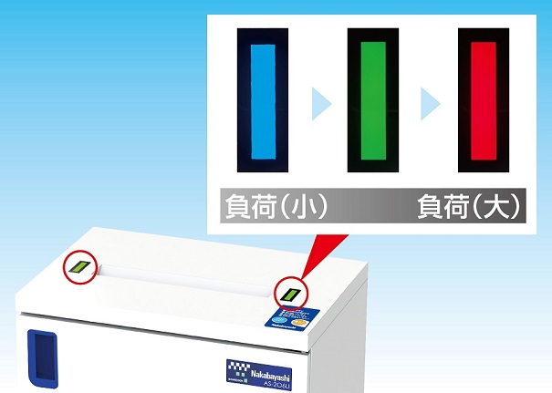 紙の投入による負荷状況をLEDの色の変化でリアルタイムに表示。青・緑色でご使用いただくことで過負荷を防ぎ故障率の軽減に貢献します。 |