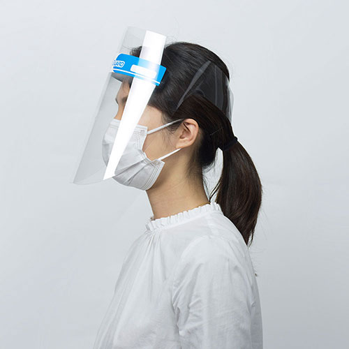 飛沫飛散対策に使えるフェイスシールドです。大型の透明シールドで、顔全体を覆うことができます。ベルトは頭のサイズに合わせ10段階の調節が可能で、斜めに入ったスリット構造により自然な角度に装着できます。