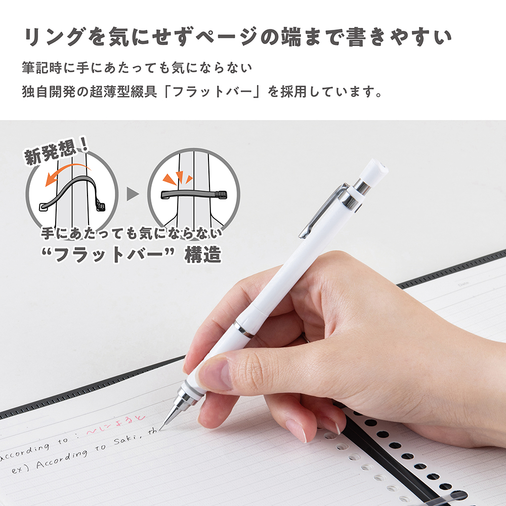 筆記時に手に当たっても気にならない独自開発の超薄型綴具「フラットバー」を採用しました。