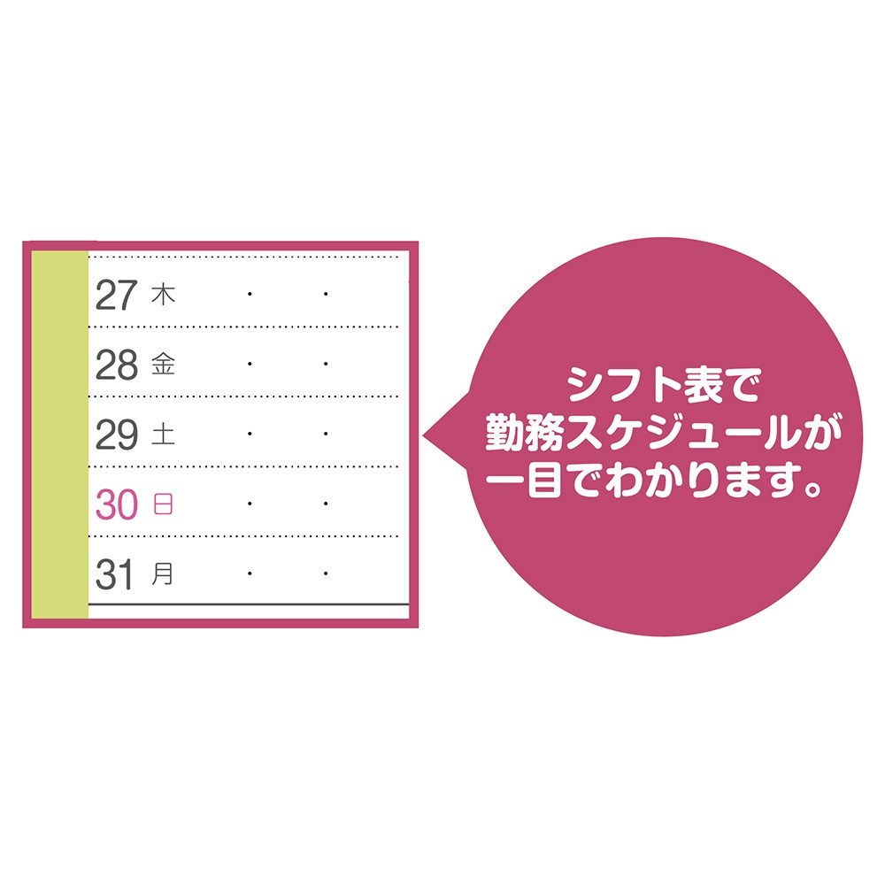 勤務スケジュール管理に便利なシフト表がマンスリーページにあるので便利!常に持ち歩きたくなるコンパクトなサイズ感の手帳です。
