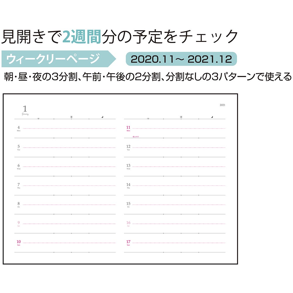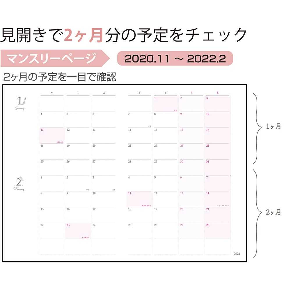 ビジネスでもプライベートの時間でも。書くことが楽しくなる手帳です。マンスリーページは2か月の予定を一目で確認できます。