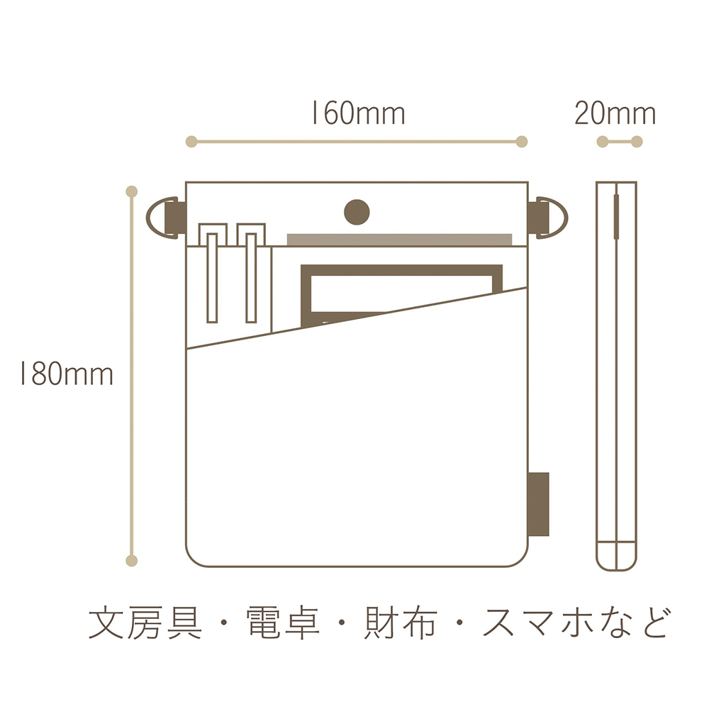 | サイズ/重量 | 本体:W160×H180×D20mm/85g ショルダ―ベルト:600〜1200mm幅15mm |