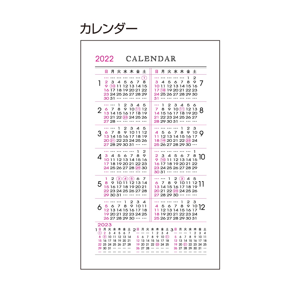 | 内容 | カレンダー、年間スケジュール、月間スケジュール(翌年4月まで)、週間スケジュール、ノート、別冊アドレス、おぼえ |