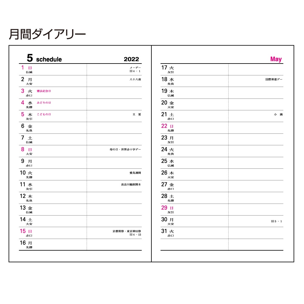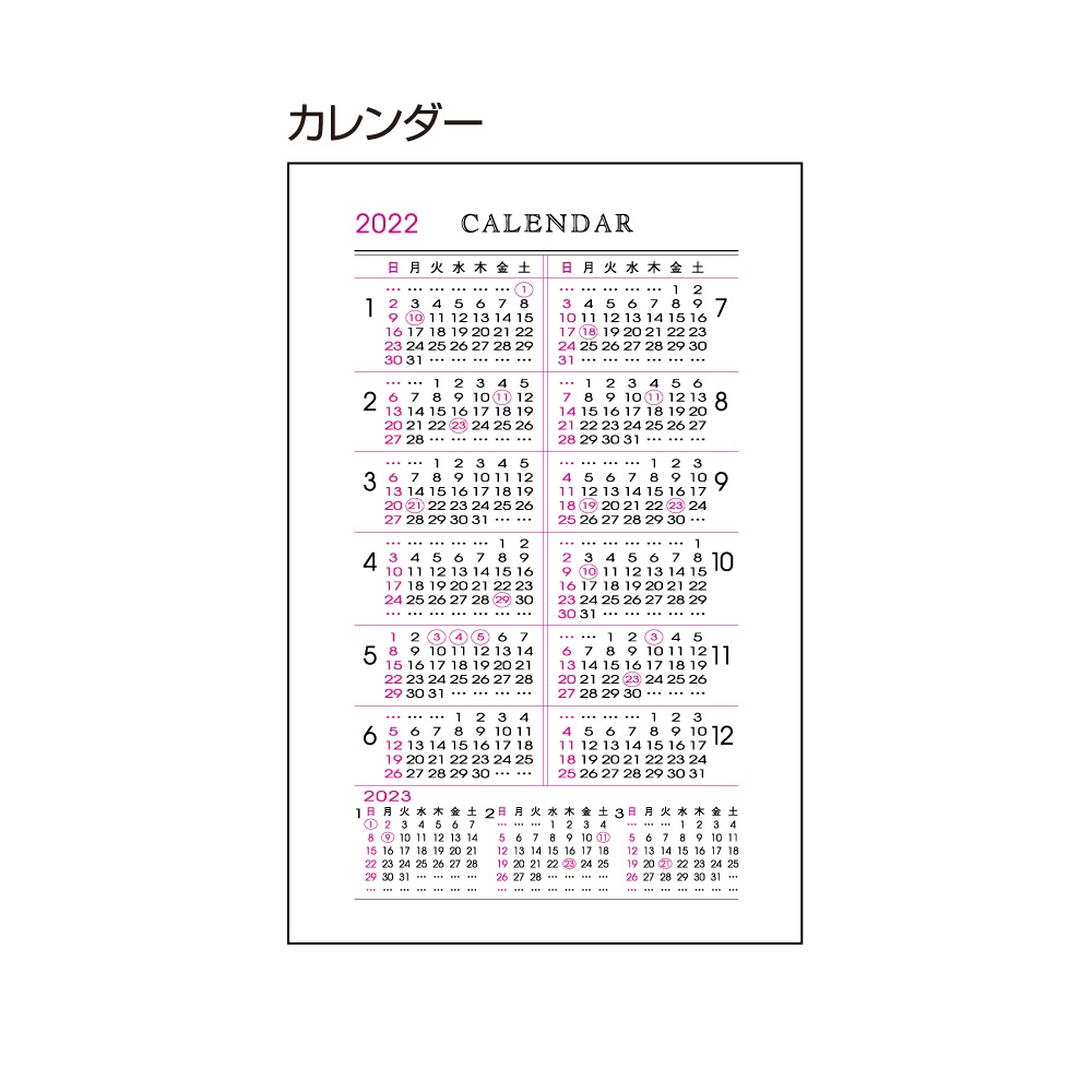 | 内容 | カレンダー、年間スケジュール、月間スケジュール(翌年4月まで)、週間スケジュール、ノート、別冊アドレス、おぼえ |