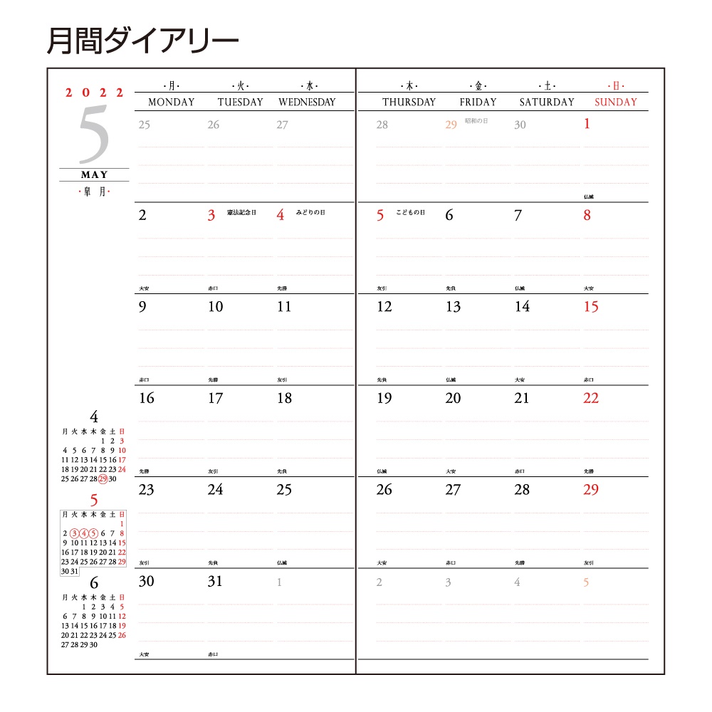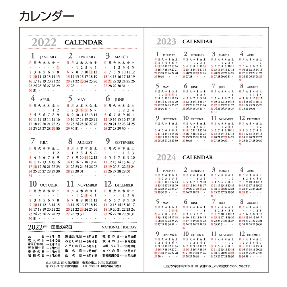| 内容 | カレンダー、年間スケジュール、月間スケジュール(翌年4月まで)、週間スケジュール、ノート、別冊アドレス、おぼえ |
