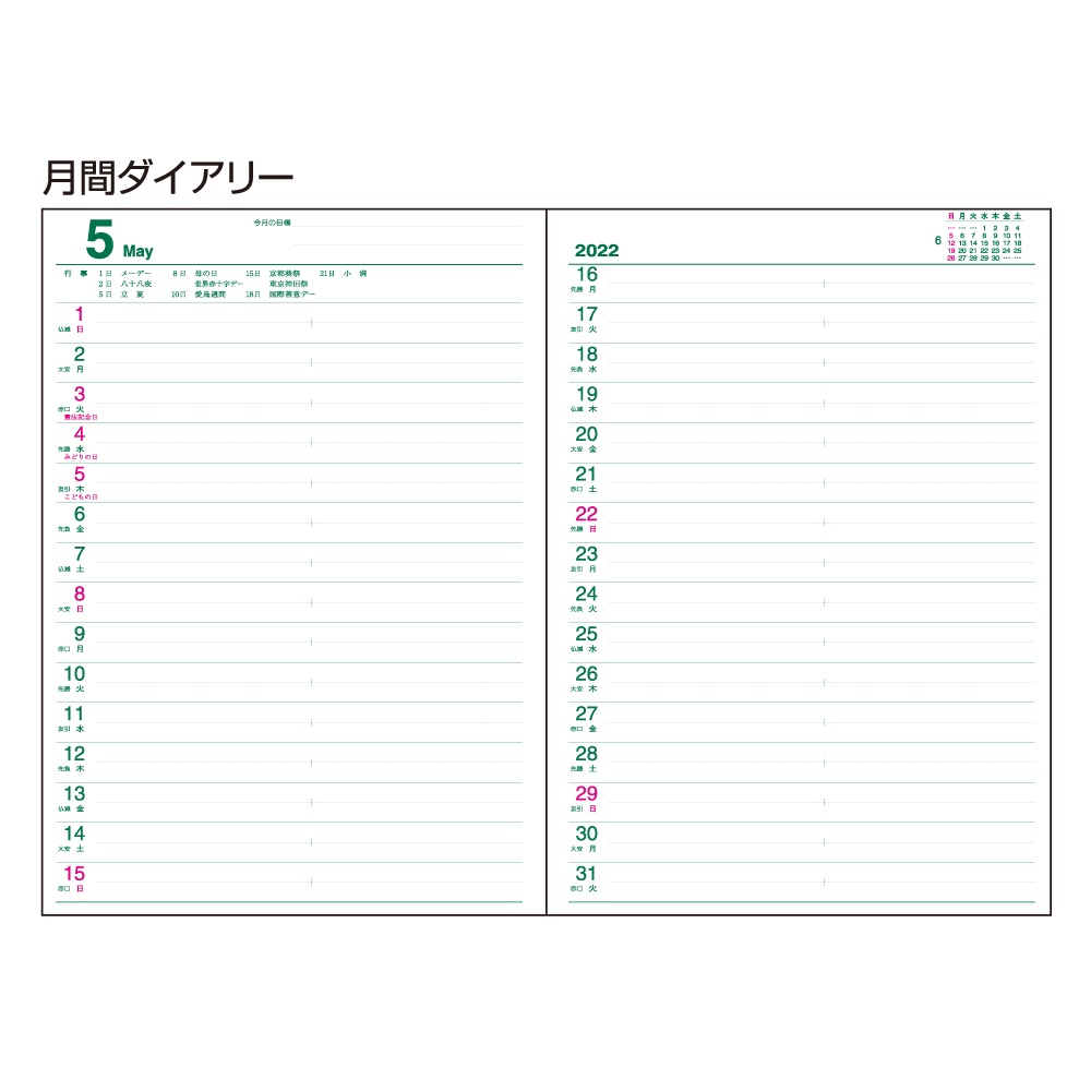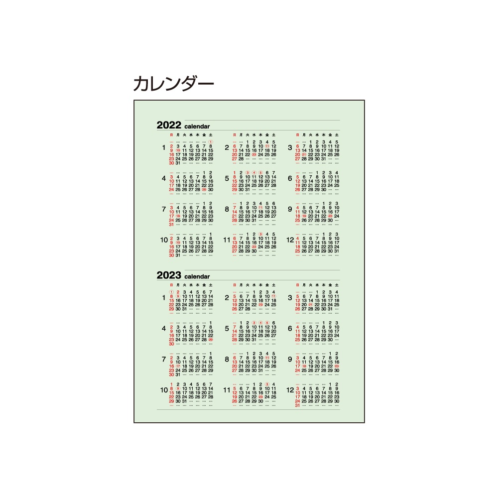 | 内容 | カレンダー、年間スケジュール、月間スケジュール(翌年4月まで)、ノート77頁、アドレス、おぼえ |