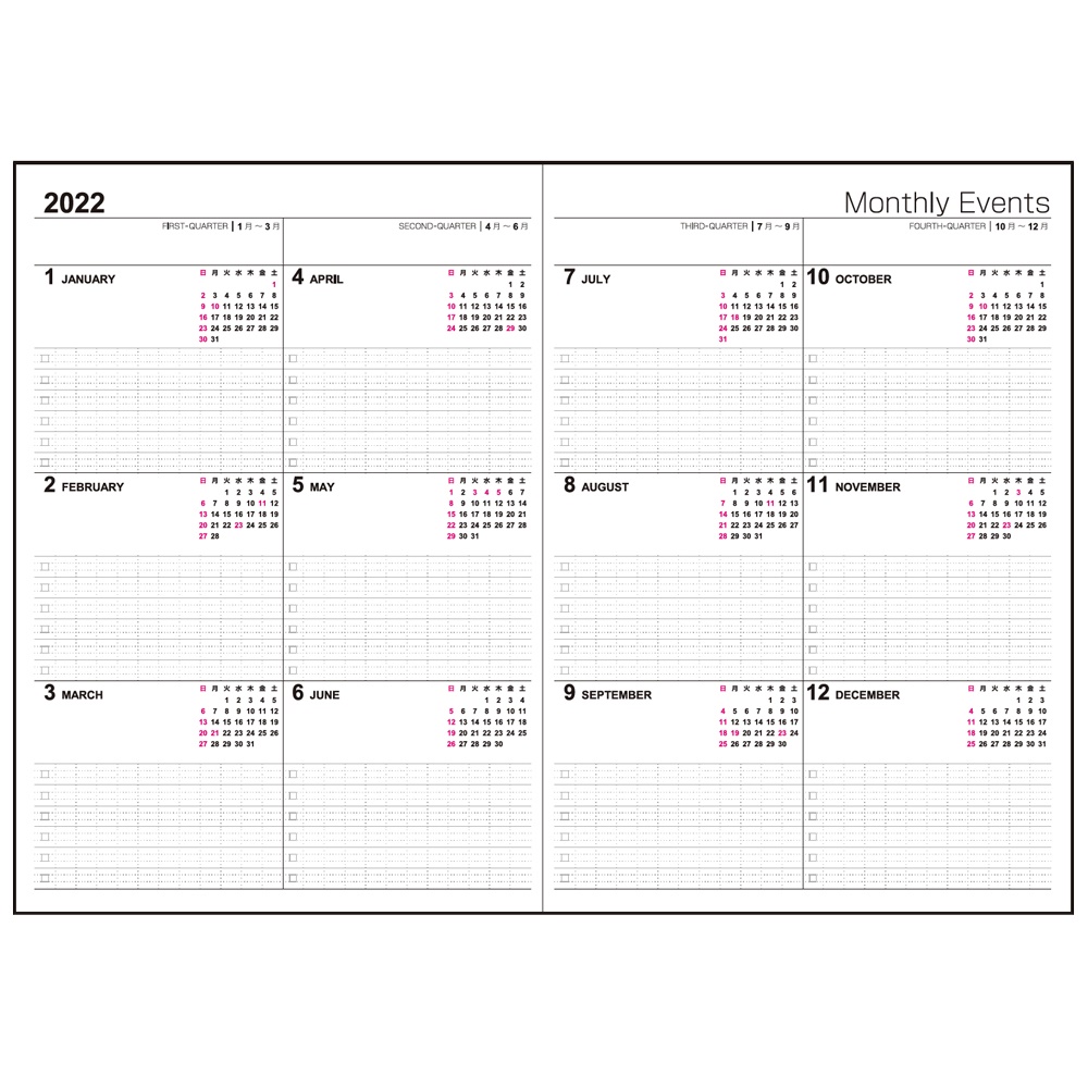 - ミニカレンダー付きイベントページを巻頭に掲載し、一年間のスケジュールを視覚的にまとめられます。