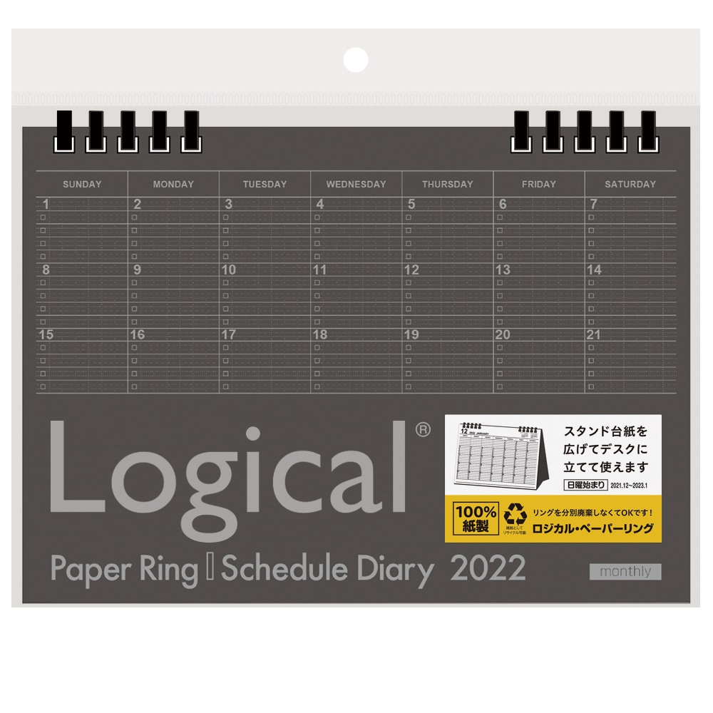 【FSC® 認証商品】樹脂を含まない100%紙製のため全てをリサイクル可能な雑紙として分類されます。用紙と綴じ具を分別する必要がありません。●きれいに記入できて読みやすいロジカル罫を月間カレンダーに採用。日曜始まり。●台紙を広げるだけで卓上カレンダーに!