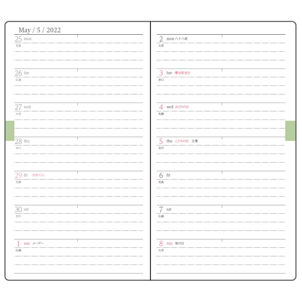 勤務スケジュール管理に便利なシフト表がマンスリーページにあるので便利!常に持ち歩きたくなるコンパクトなサイズ感の手帳です。