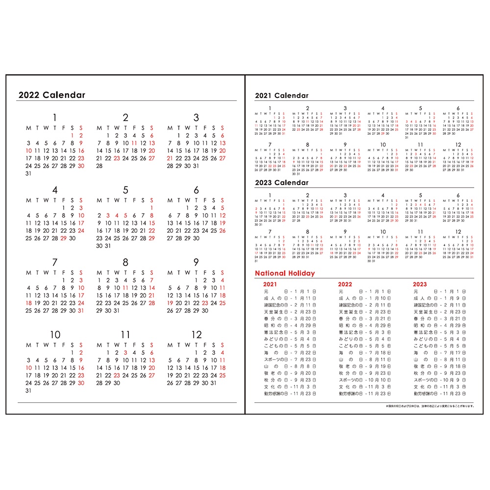 月間スケジュール/収支のまとめ月間頁の記入欄が大きくなり、予定と収支の照らし合わせもよりしやすくなりました!1ヶ月の支出支出分類が8項目まで記入できます。