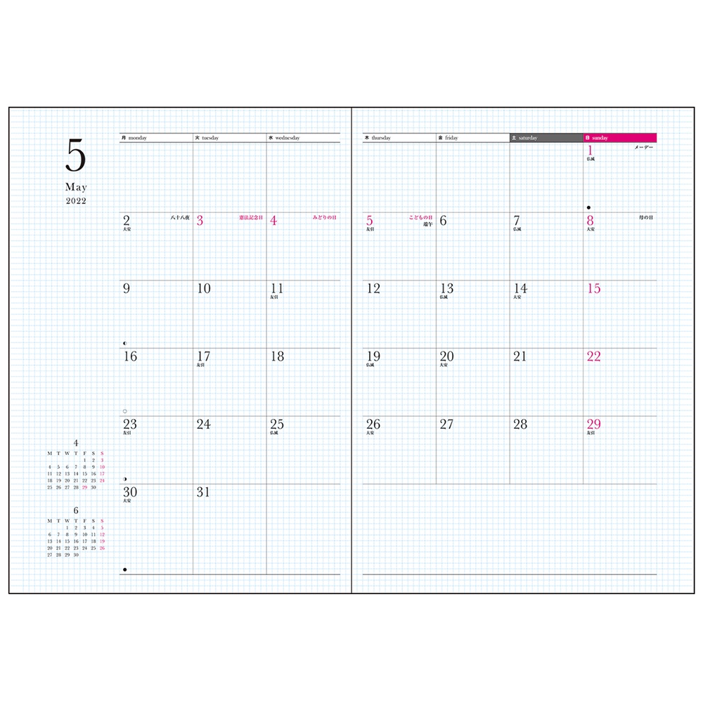 マンスリーとレフト式のウィークリーでたっぷり書ける方眼罫を採用した手帳です。