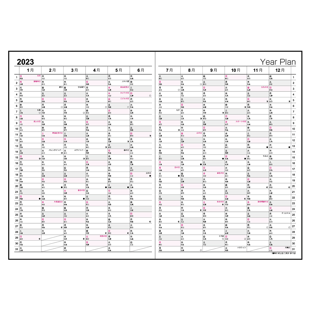 | 収録内容 | 年間カレンダー、イヤープラン、イベントページ、 月間スケジュール(2022年12月〜2024年3月、ブロック式、日曜始まり) フリープラン、ノートページ(ロジカル罫) |