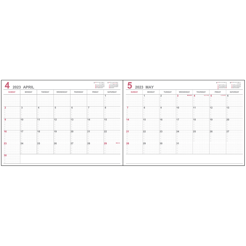- 見開き2か月分の予定が把握できる月間ブロックタイプ