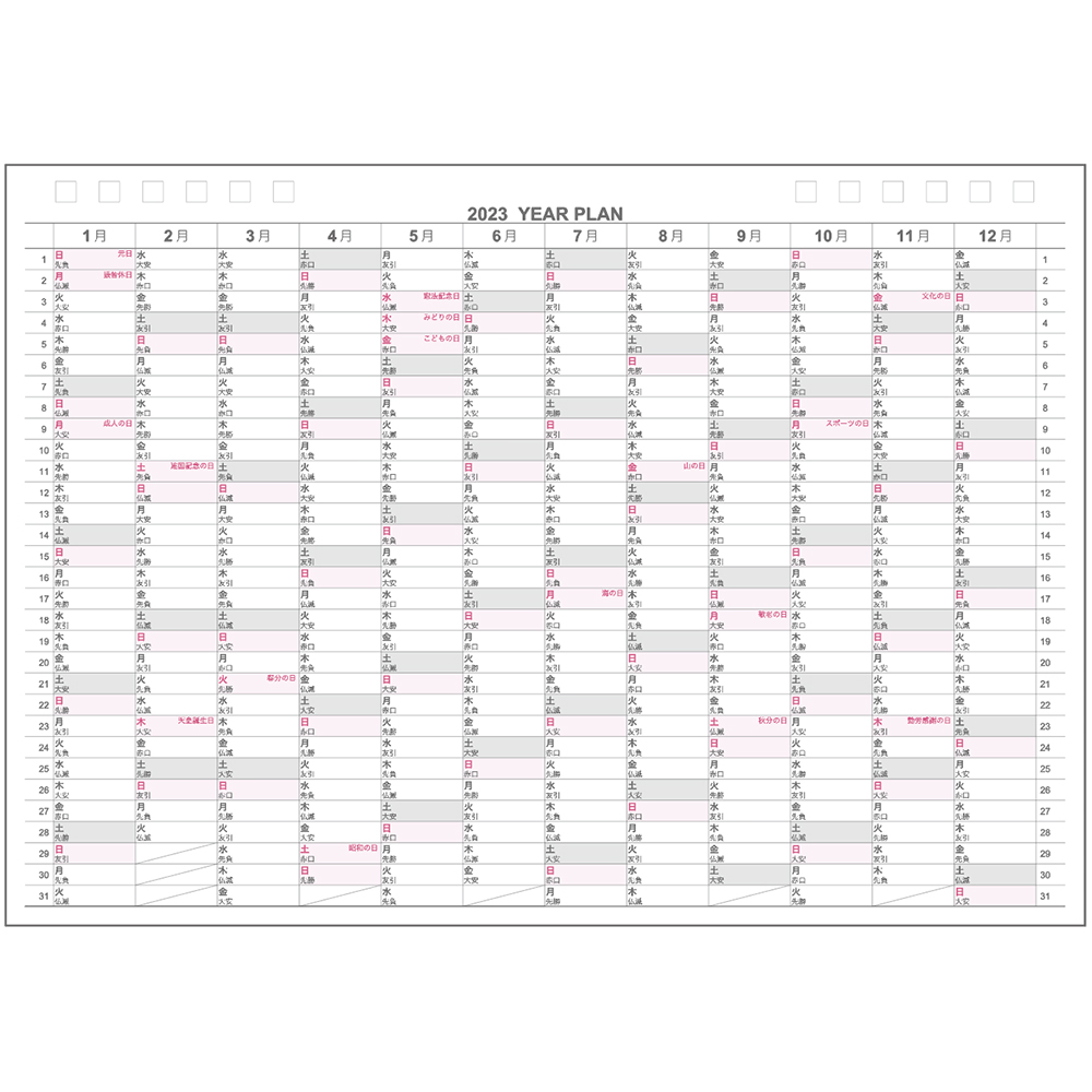 | 収録内容 | 年間カレンダー、イヤープラン、イベントページ、 月間スケジュール(2022年12月〜2024年3月、ブロック式、日曜始まり) フリープラン、ノートページ(ロジカル罫) |
