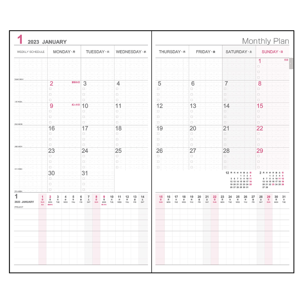 | 収録内容 | 年間カレンダー、イヤープラン、 月間スケジュール(2022年12月〜2024年3月、ブロック式、日曜始まり) ロジカル方眼罫ノート |