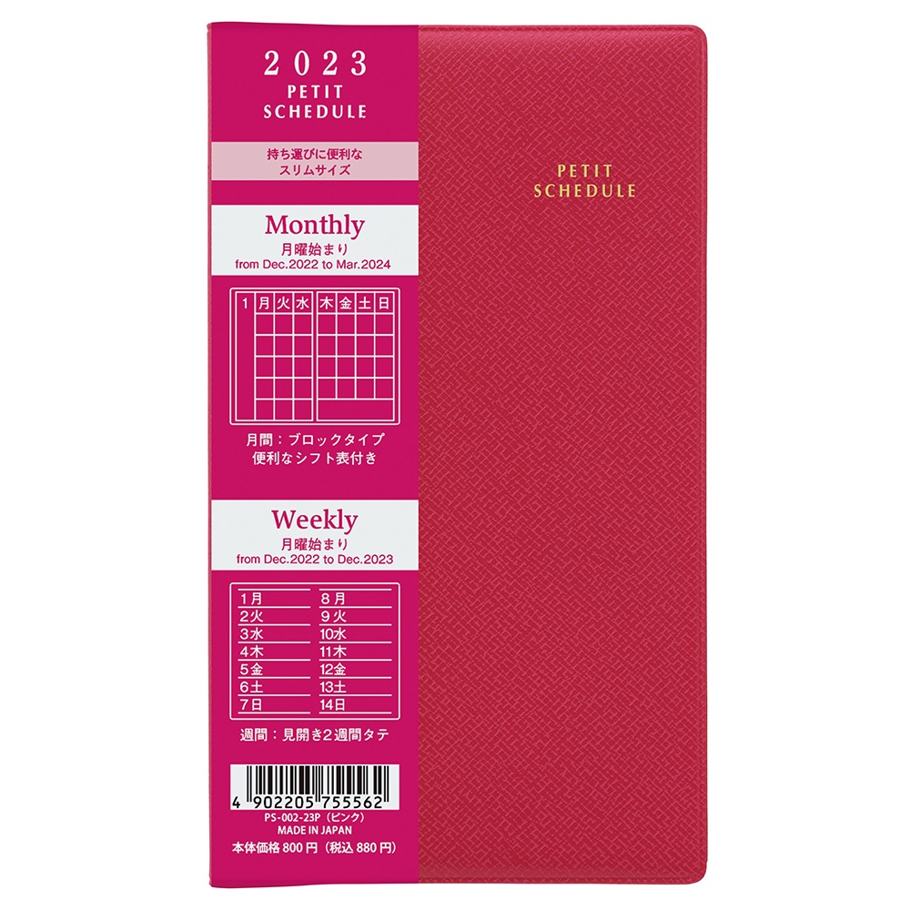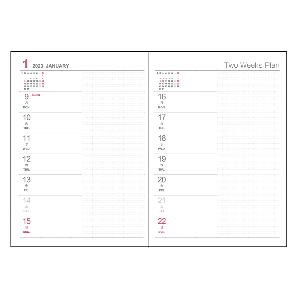 | 収録内容 | 年間カレンダー、イヤープラン、イベントページ、 月間スケジュール(2022年12月〜2024年3月、ブロック式、日曜始まり) フリープラン、ノートページ(ロジカル罫) |