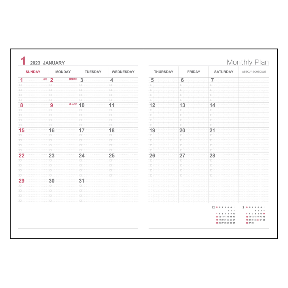 月間スケジュール(見開き1 ヶ月・ブロック式/日曜日始まり)+週間スケジュール(見開き2 週間・リスト式/月曜日始まり)
