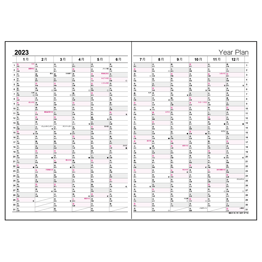 | 収録内容 | 年間カレンダー、イヤープラン、イベントページ、 月間スケジュール(2022年12月〜2024年3月、ブロック式、日曜始まり) フリープラン、ノートページ(ロジカル罫) |