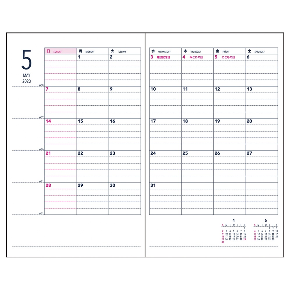 仕事でもプライベートでも使える人気のA5スリムサイズのノートダイアリー。カレンダーとリンクさせるのに便利な、日曜始まりタイプです。
