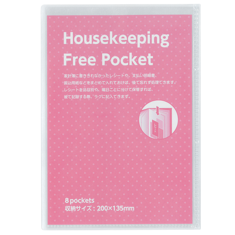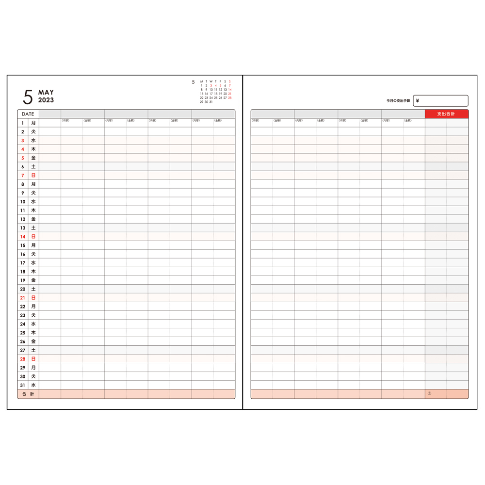 記入欄が大きく、予定と収支の照らし合わせがしやすい月間スケジュール。1ヶ月の支出ページで支出分類が8項目まで記入できます。レシート類を分類収納できる別冊フリーポケット付き