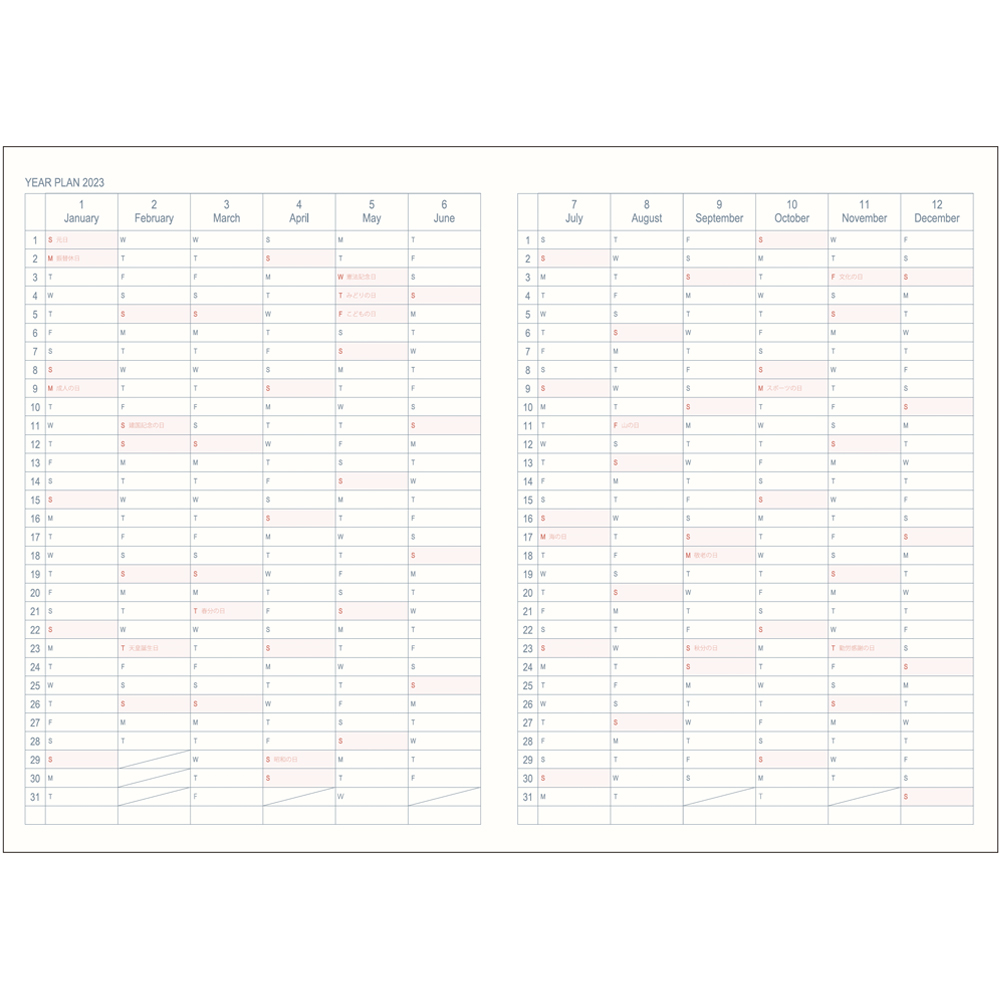 | 仕様・価格 | ■クォーター 品番:NS-A510-23 本体サイズ:ヨコ150×タテ217×厚み8mm 本体重量:204g メーカー希望小売価格:1,200円(税込1,320円) 本文:上質紙・128ページ 収録内容:年間カレンダー、イヤープラン、月間ページ(ブロック+リスト 2022.12〜2024.1 月曜始まり)、ノートページ(本文罫:7.5mm / 24行 97ページ収録) ■ハーフ 品番:NS-A511-23 本体サイズ:ヨコ150×タテ217×厚み12mm 本体重量:310g メーカー希望小売価格:1,400円(税込1,540円) 本文:上質紙・216ページ収録内容:年間カレンダー、イヤープラン、月間ページ(ブロック+リスト 2022.12〜2024.1 月曜始まり)、ノートページ(本文罫:7.5mm / 24行 185ページ収録) ■スタンダード 品番:NS-A512-23 本体サイズ:ヨコ150×タテ217×厚み21mm 本体重量:532g メーカー希望小売価格:1,800円(税込1,980円) 本文:上質紙・400ページ収録内容:年間カレンダー、イヤープラン月間ページ(ブロック+リスト 2022.12〜2024.1 月曜始まり)、ノートページ(本文罫:7.5mm / 24行 369ページ収録) |